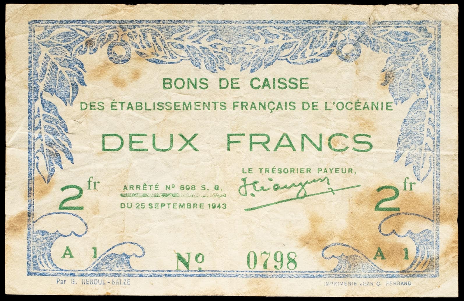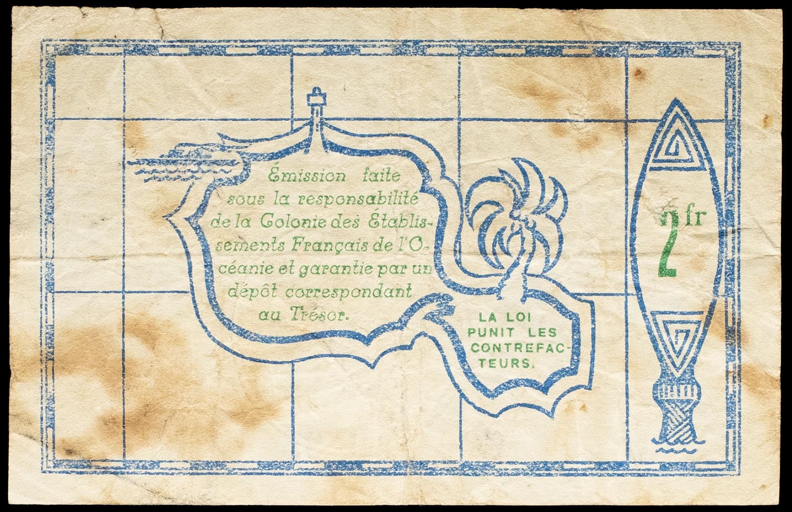 - FRENCH POLYNESIA / FRENCH OCEANIA Bon de 2 francs type “bleu et vert” 25 septembre 1943.