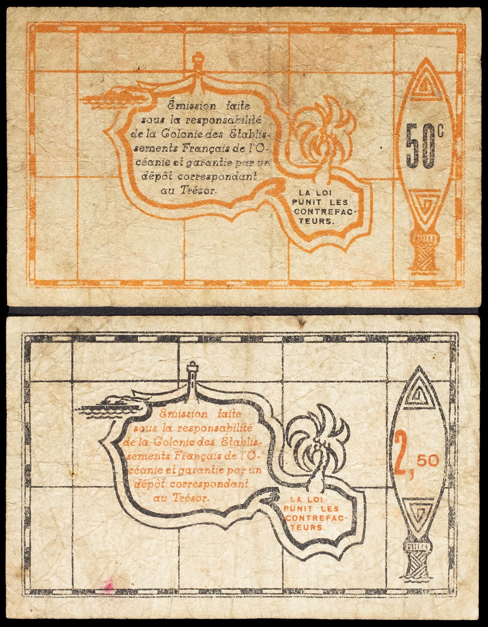 - FRENCH POLYNESIA / FRENCH OCEANIA Lot (2) - Bon de 50 centimes type “orange et noir” et 2,50 francs type “noir et rouge” 25 septembre 1943.