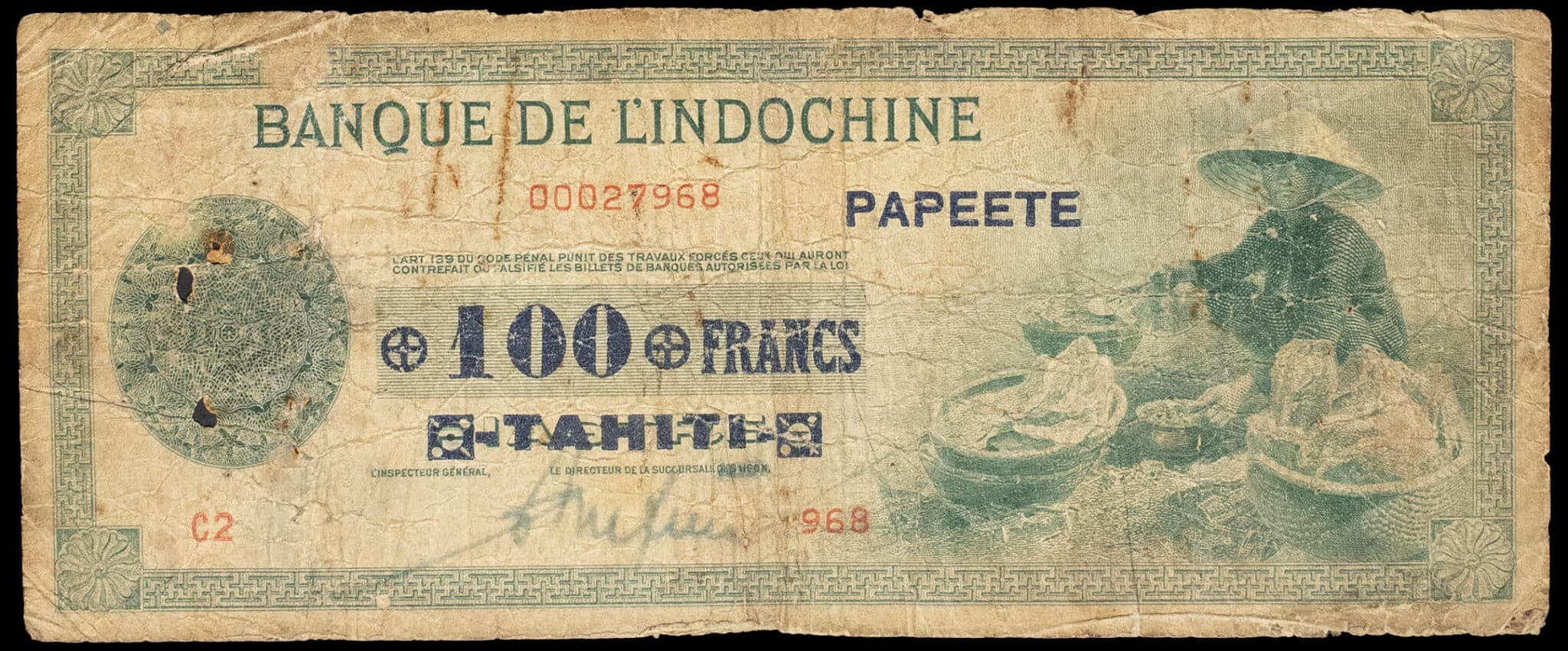 - FRENCH POLYNESIA / TAHITI 100 francs Papeete type “vert”, impression US - Banque de l’Indochine ND (1943).