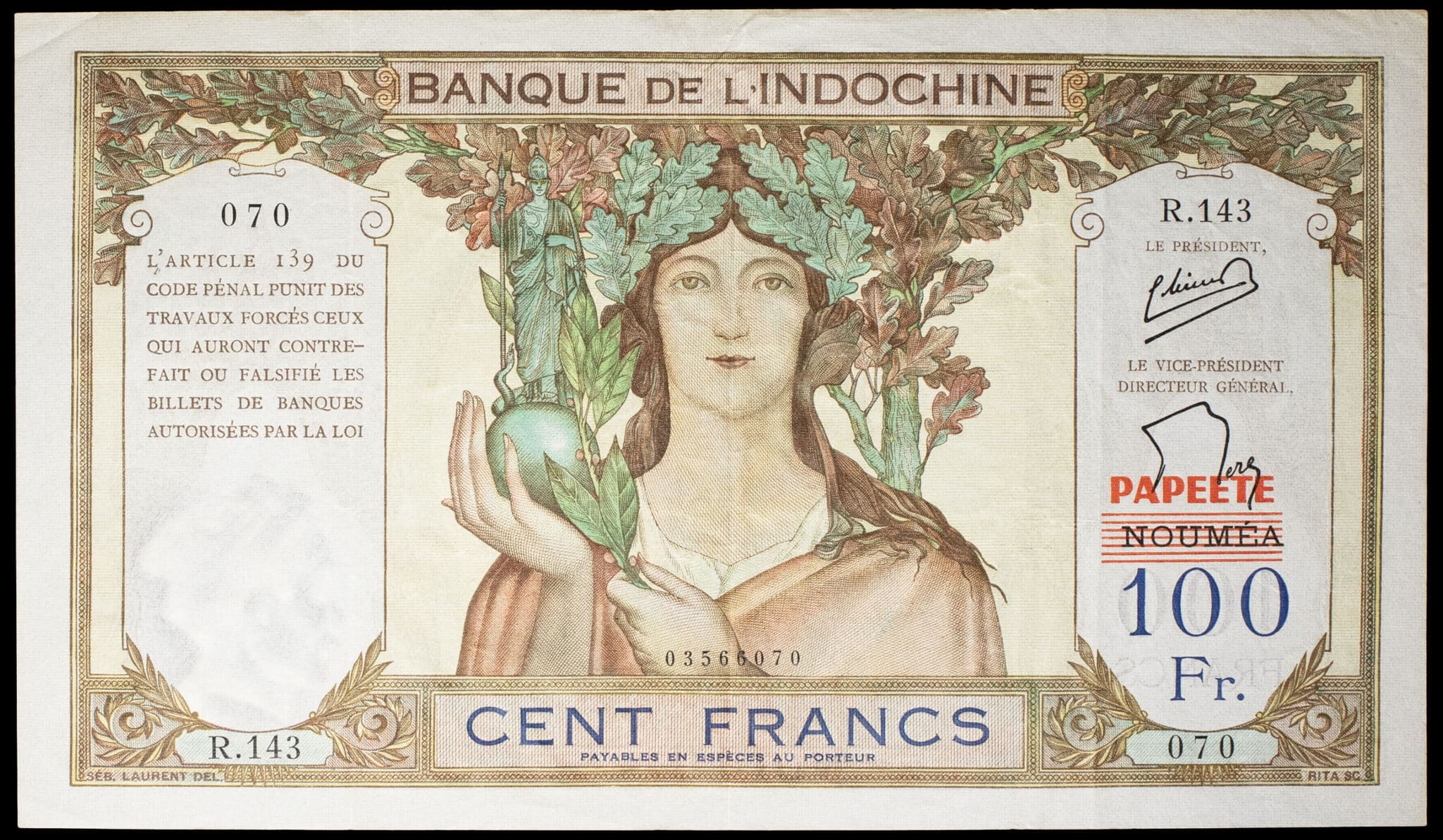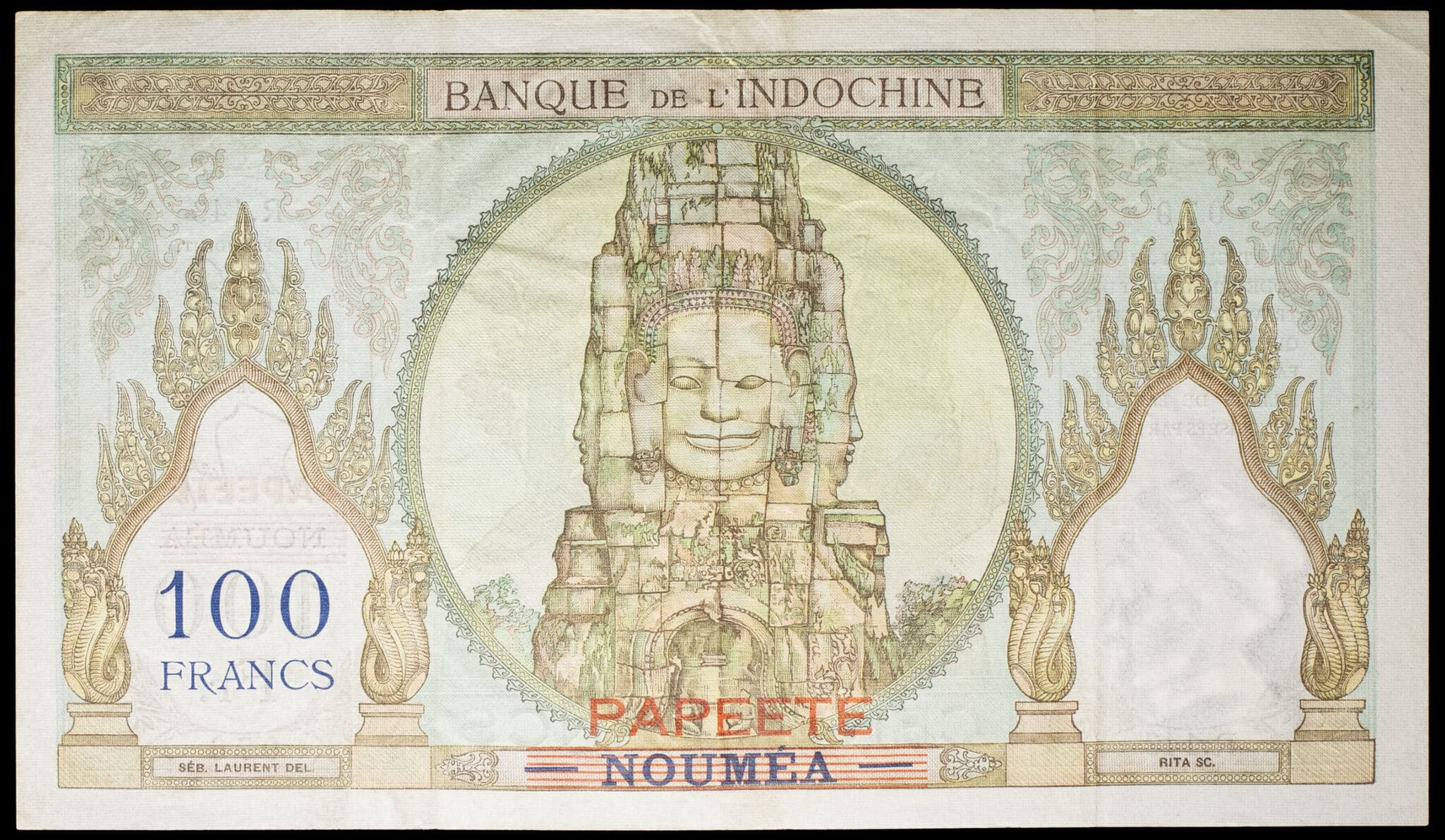 - FRENCH POLYNESIA / TAHITI 100 francs type “ruines d’Angkor” surchargé “PAPEETE” sur “NOUMÉA” - Banque de l’Indochine ND (1963).