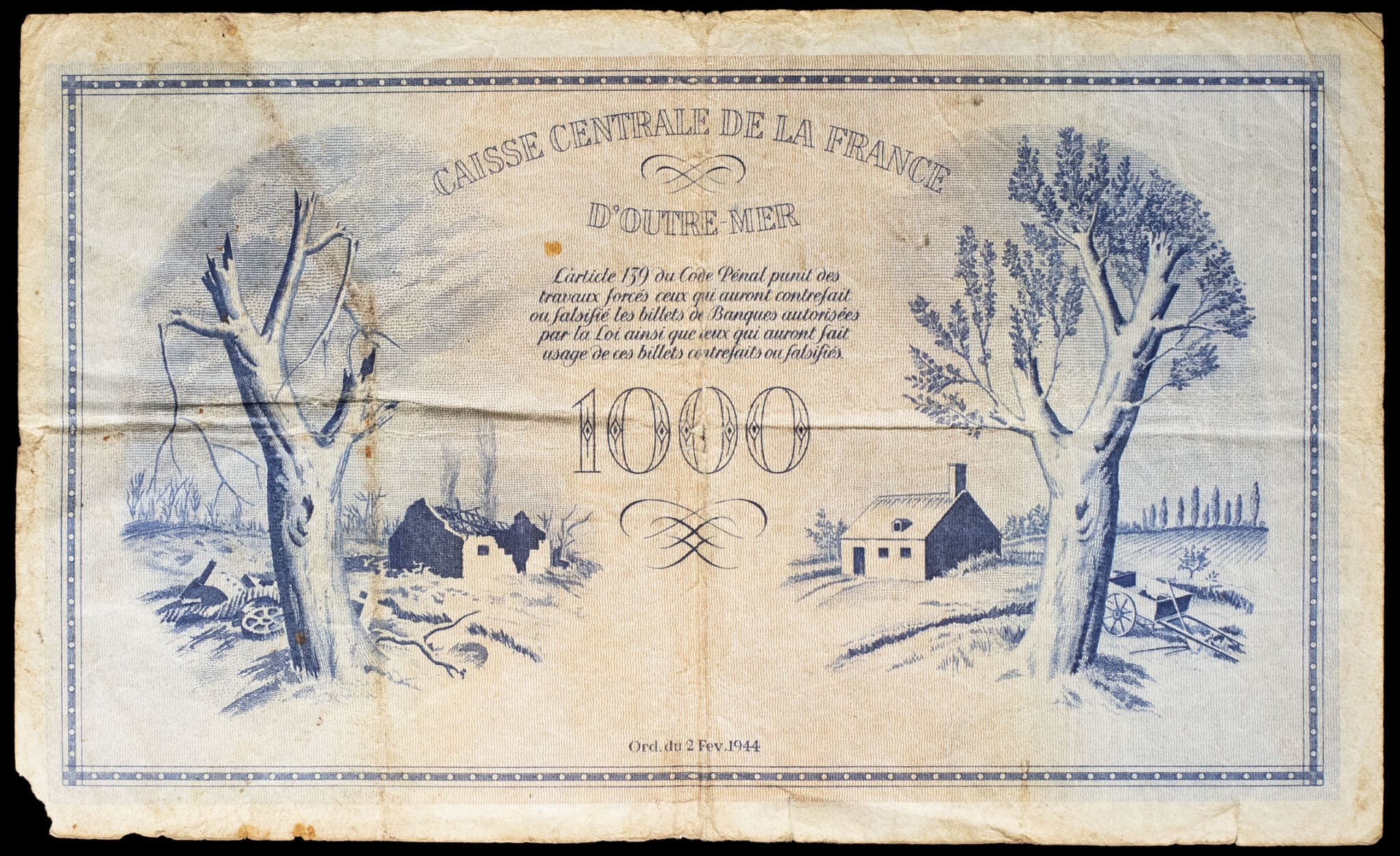 - REUNION 1000 francs type “phénix” - Caisse centrale de la France d’outre-mer 2 février 1944 (21 février 1947).