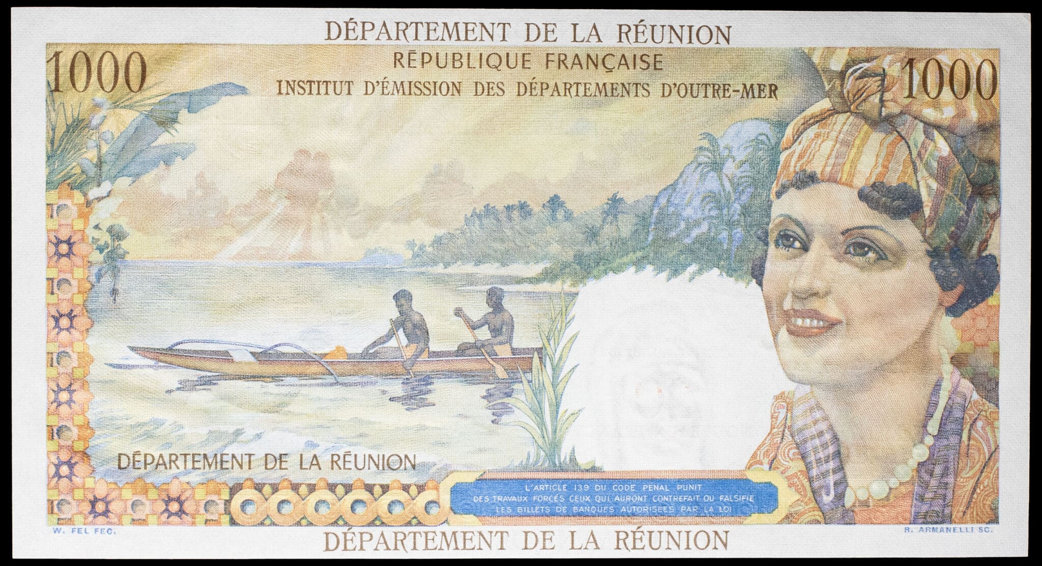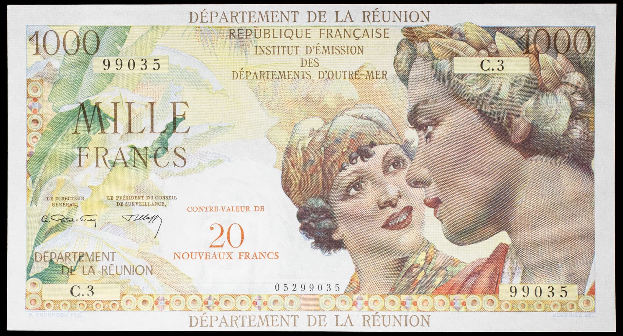 - REUNION 20 nouveaux francs surchargé sur 1000 Francs type “Union Française” - Institut d’Émission des départements d’outre-mer ND (1973).