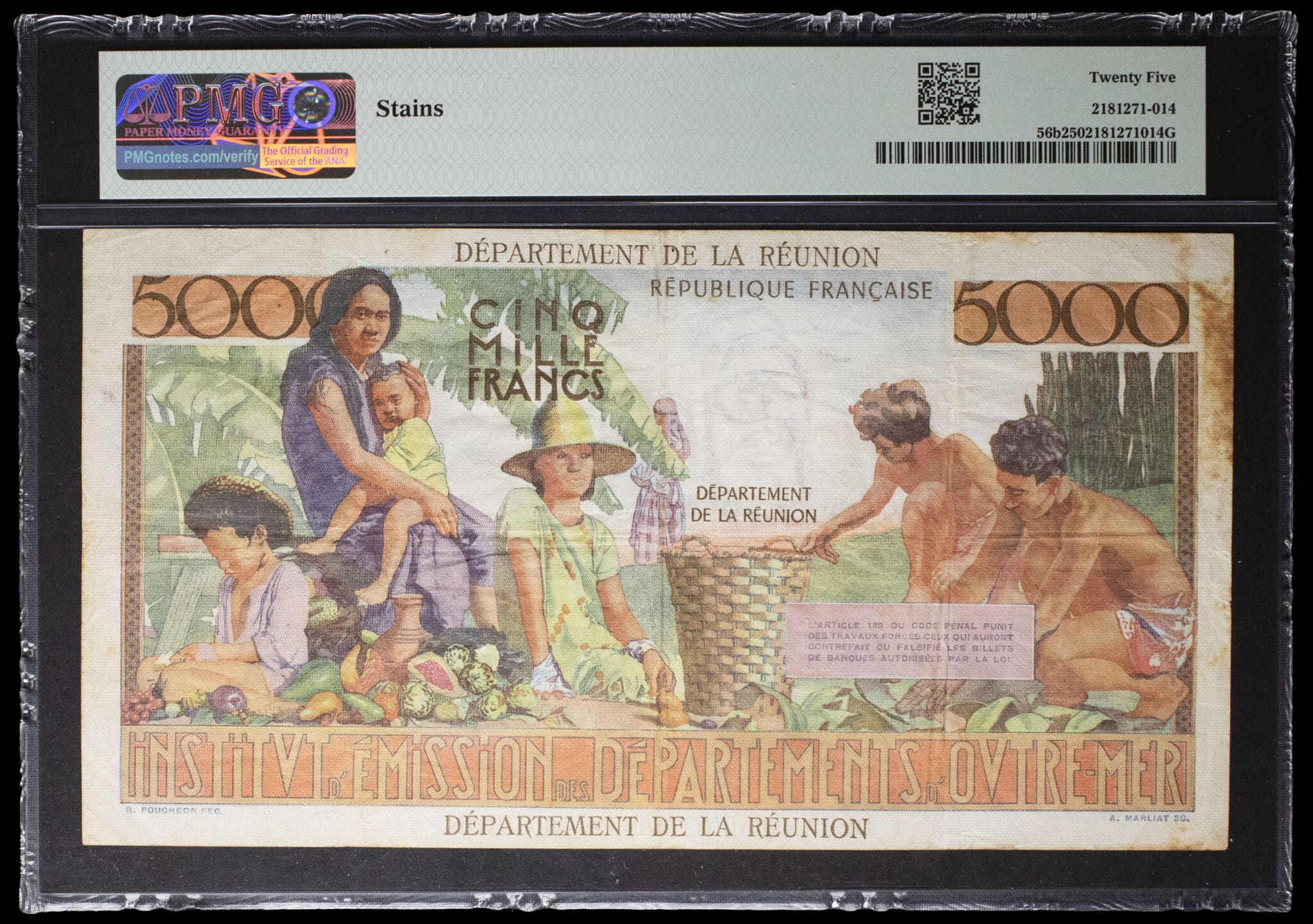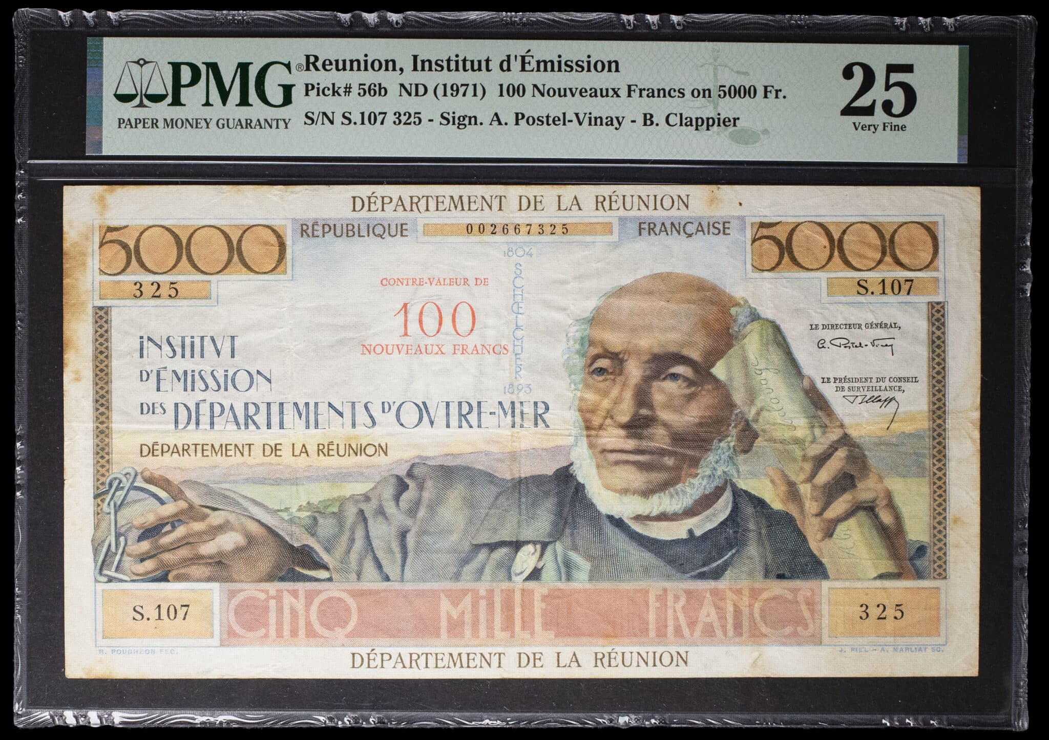 - REUNION 100 nouveaux francs surchargé sur 5000 francs type “Victor Schœlcher” - Institut d’Émission des départements d’outre-mer ND (1967).