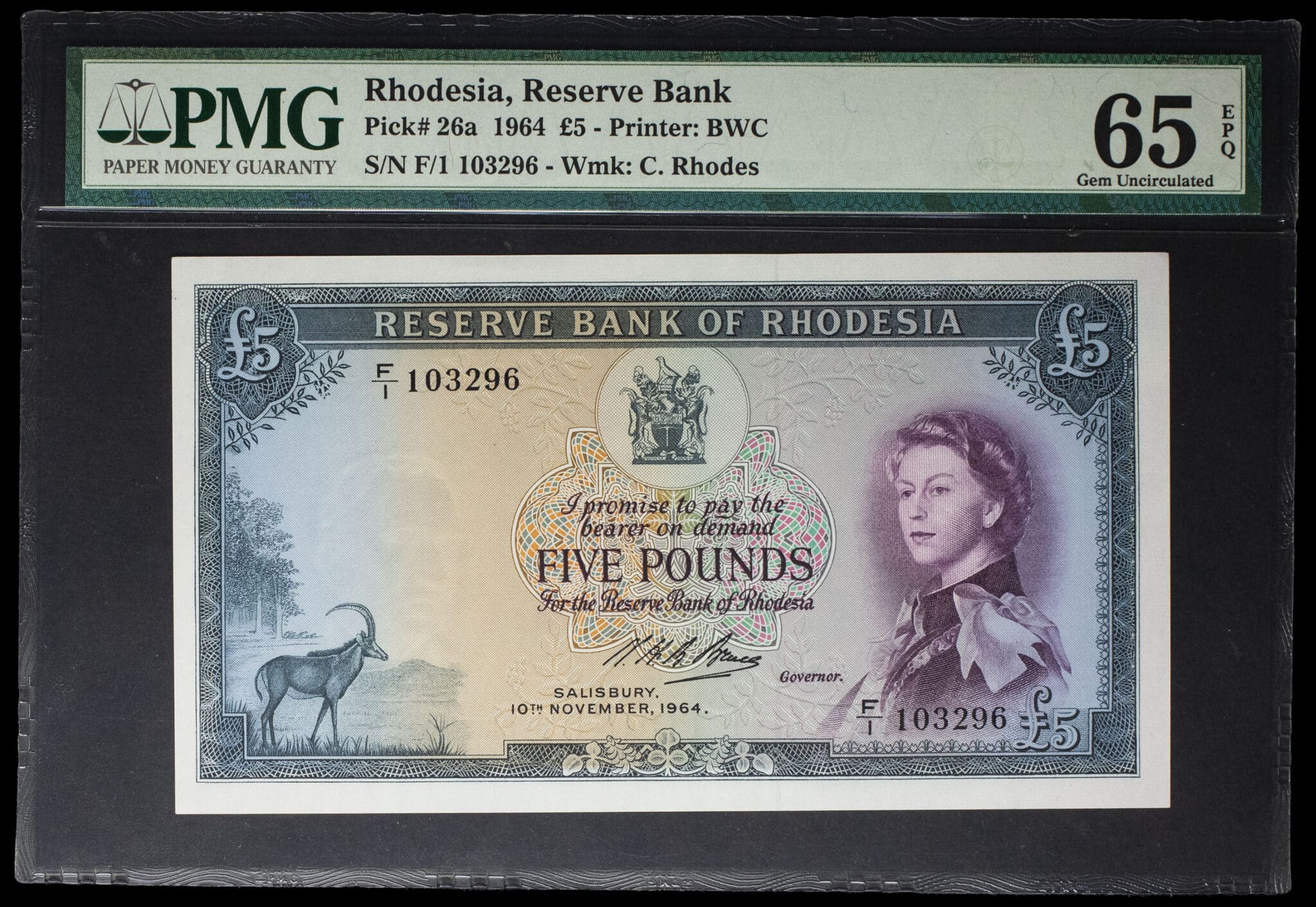 - RHODESIA 5 pounds avec le portrait de la reine Élisabeth (Elizabeth) II 10 novembre 1964.