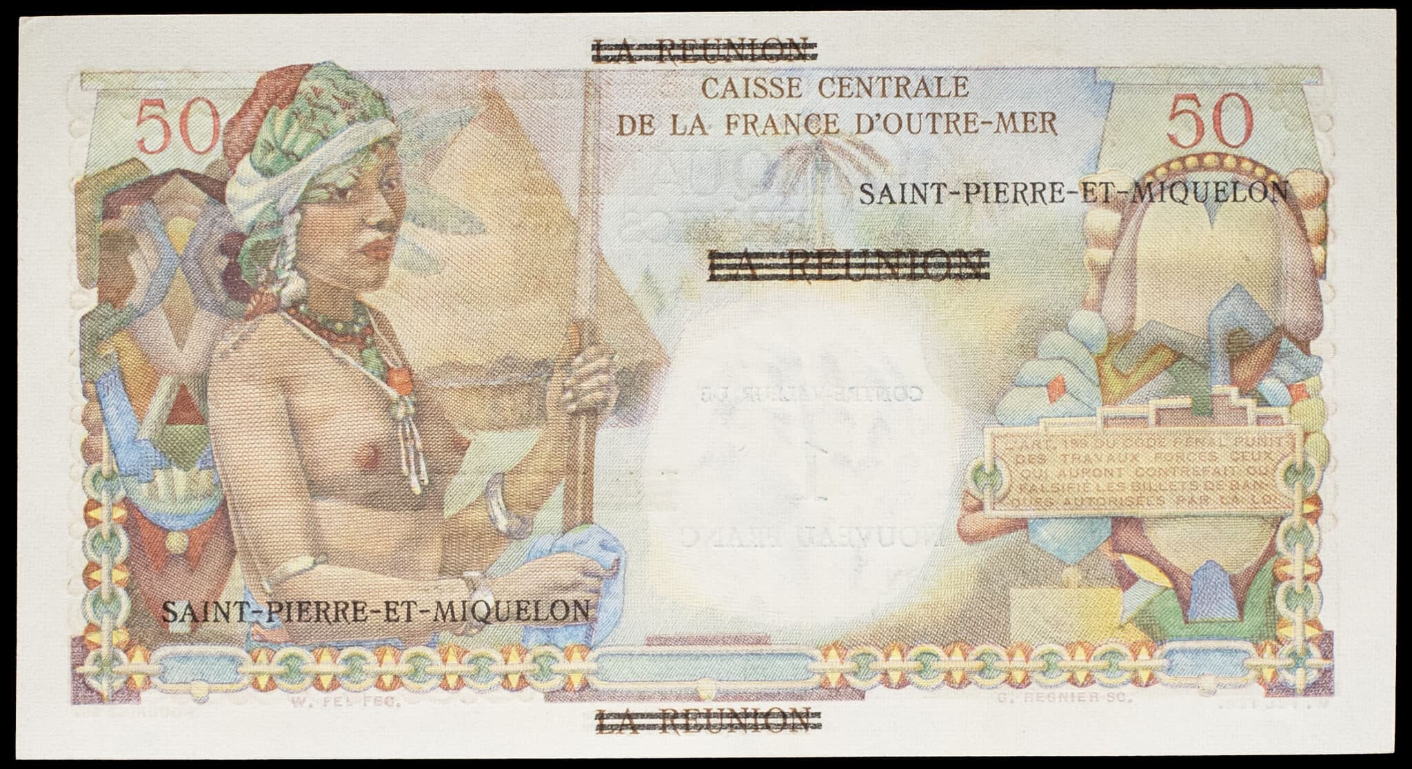 - SAINT PIERRE AND MIQUELON 1 nouveau franc surchargé sur 50 francs type “Belain d’Esnambuc” - Caisse centrale de la France d’outre-mer ND (1960).