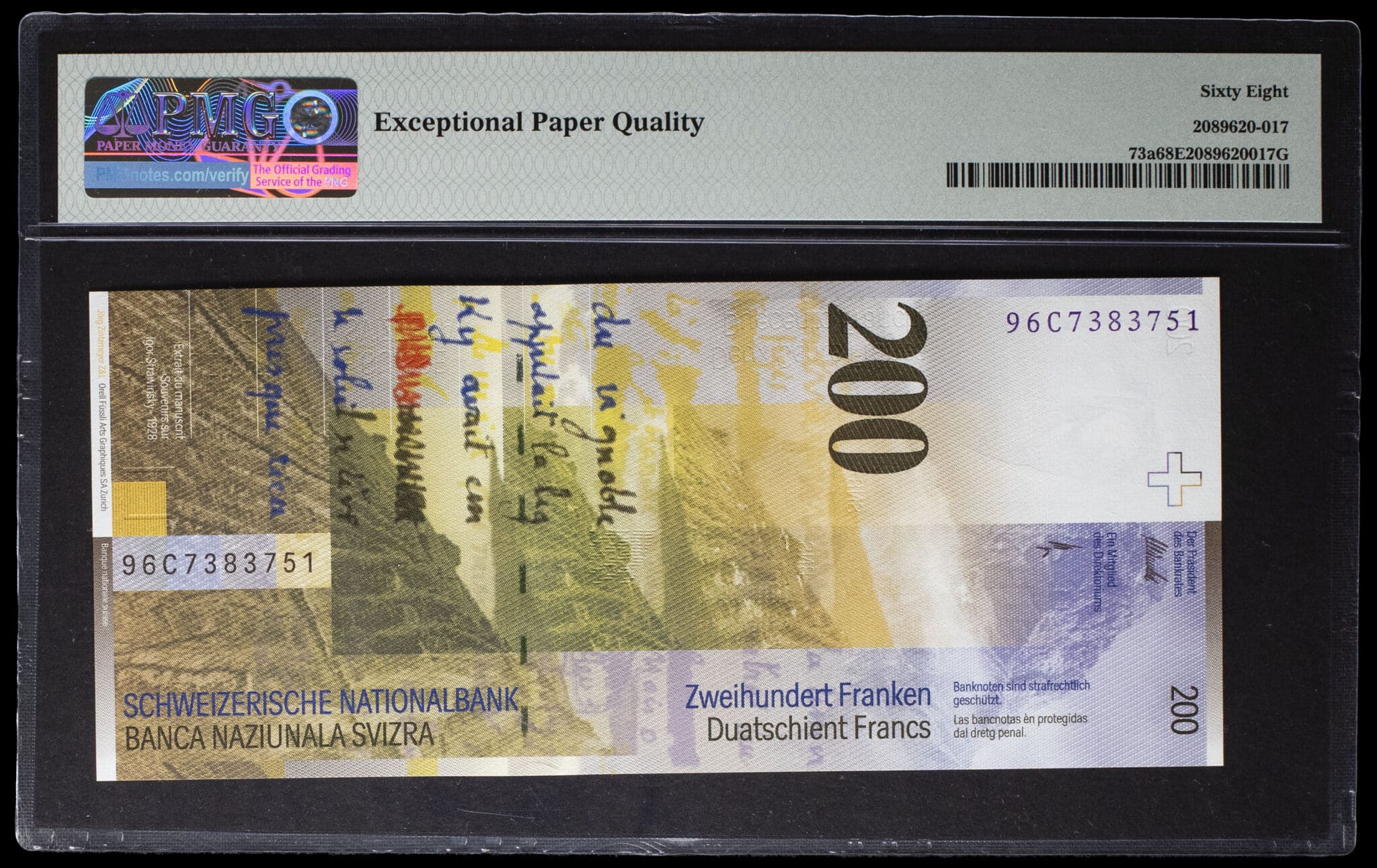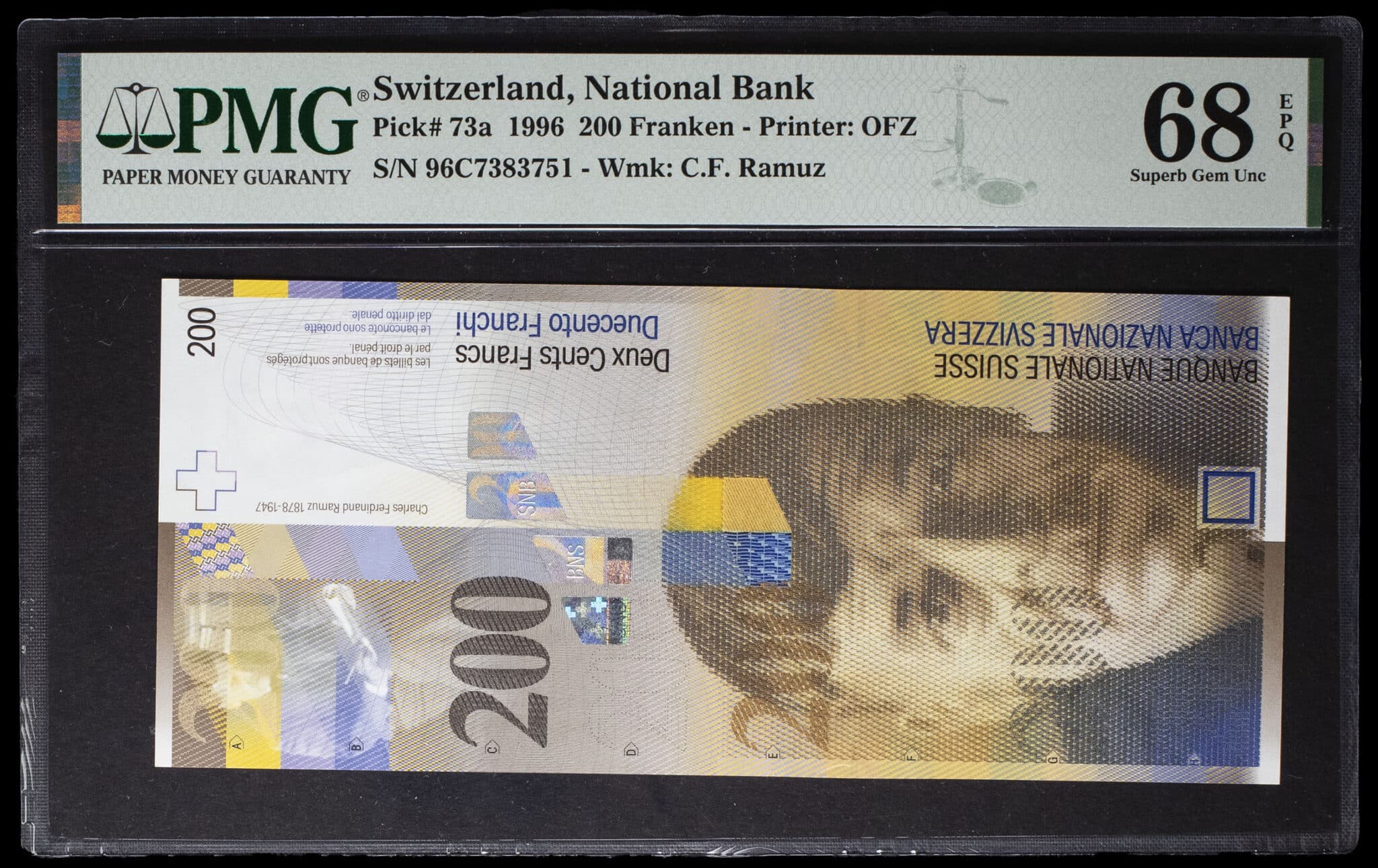- SWITZERLAND 200 francs type “Charles Ferdinand Ramuz” 1996.
