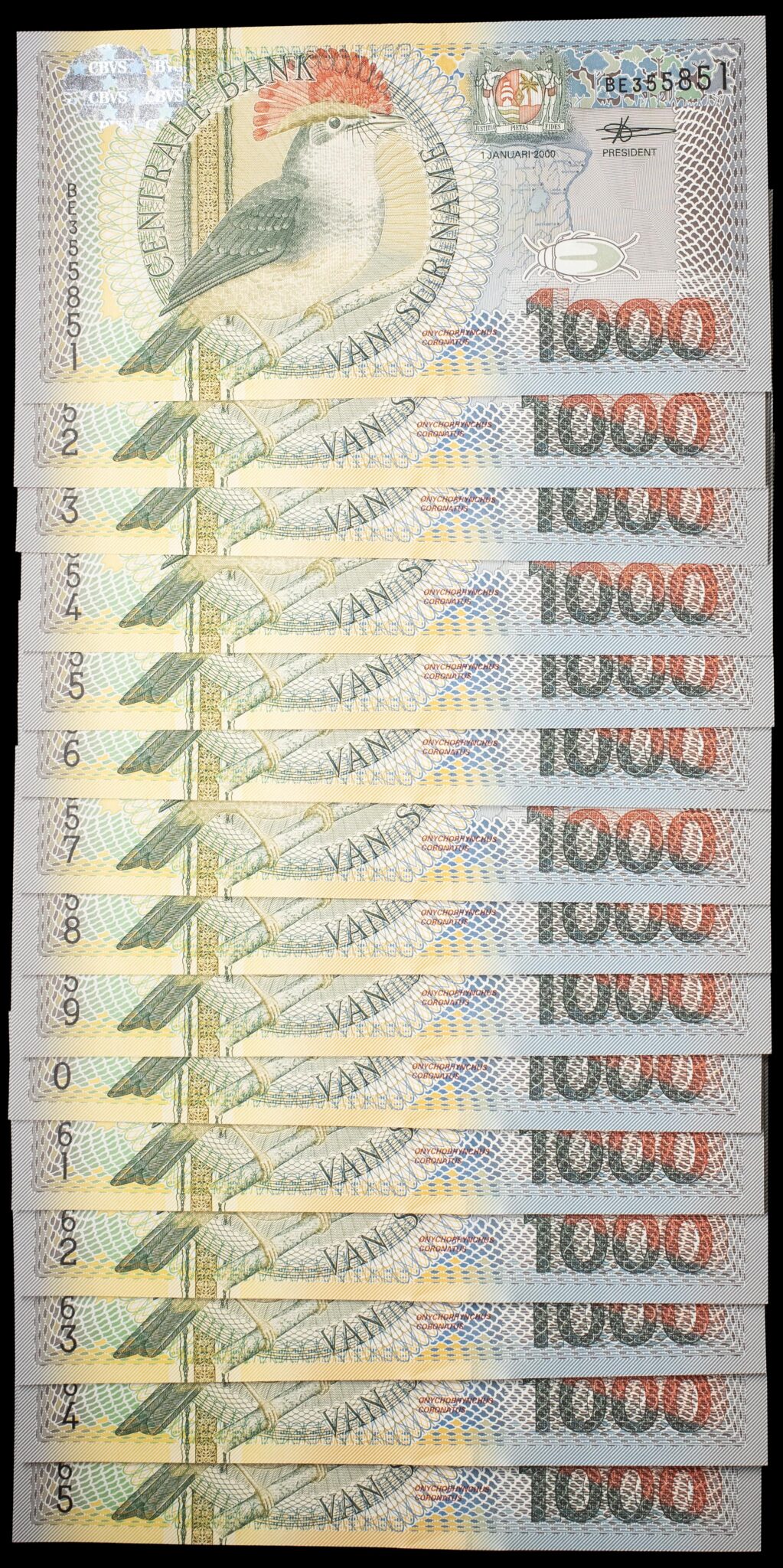 - Lot (15) - 1000 gulden type “porte-éventail roi (Onychorhynchus coronatus)” avec numéros consécutifs 1er janvier 2000.
