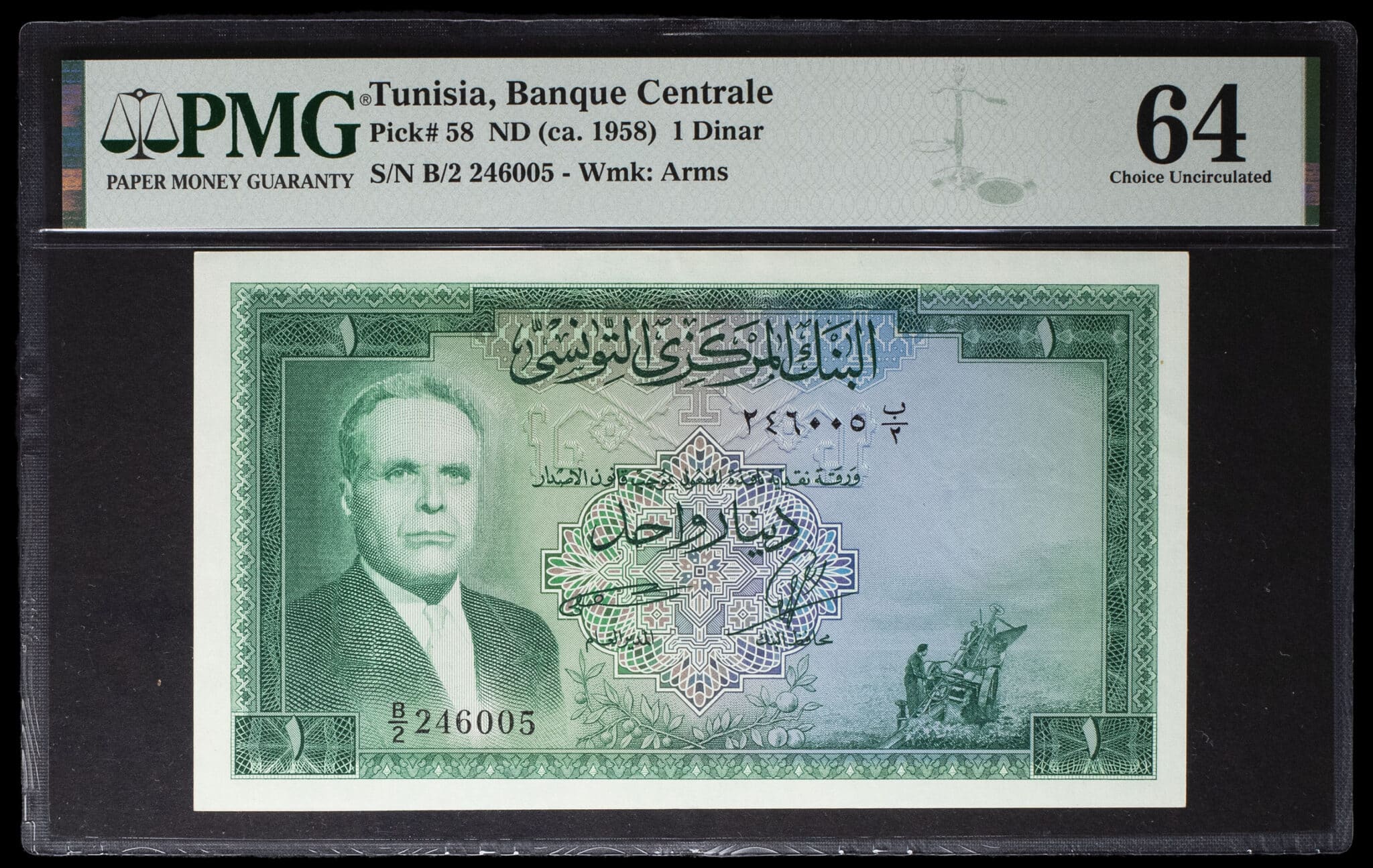 - TUNISIA 1 dinar avec le portrait du président Habib Bourguiba ND (1958).