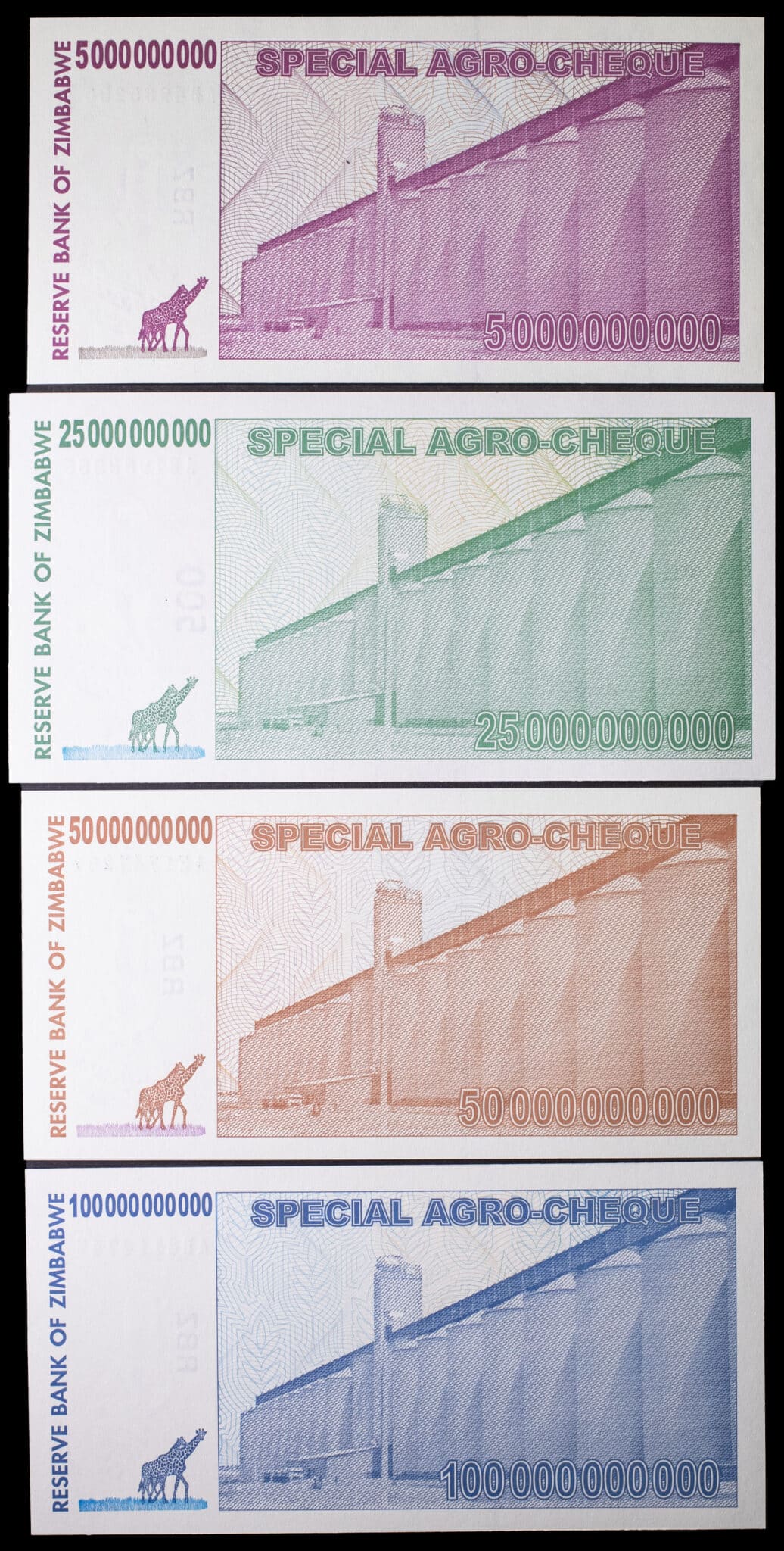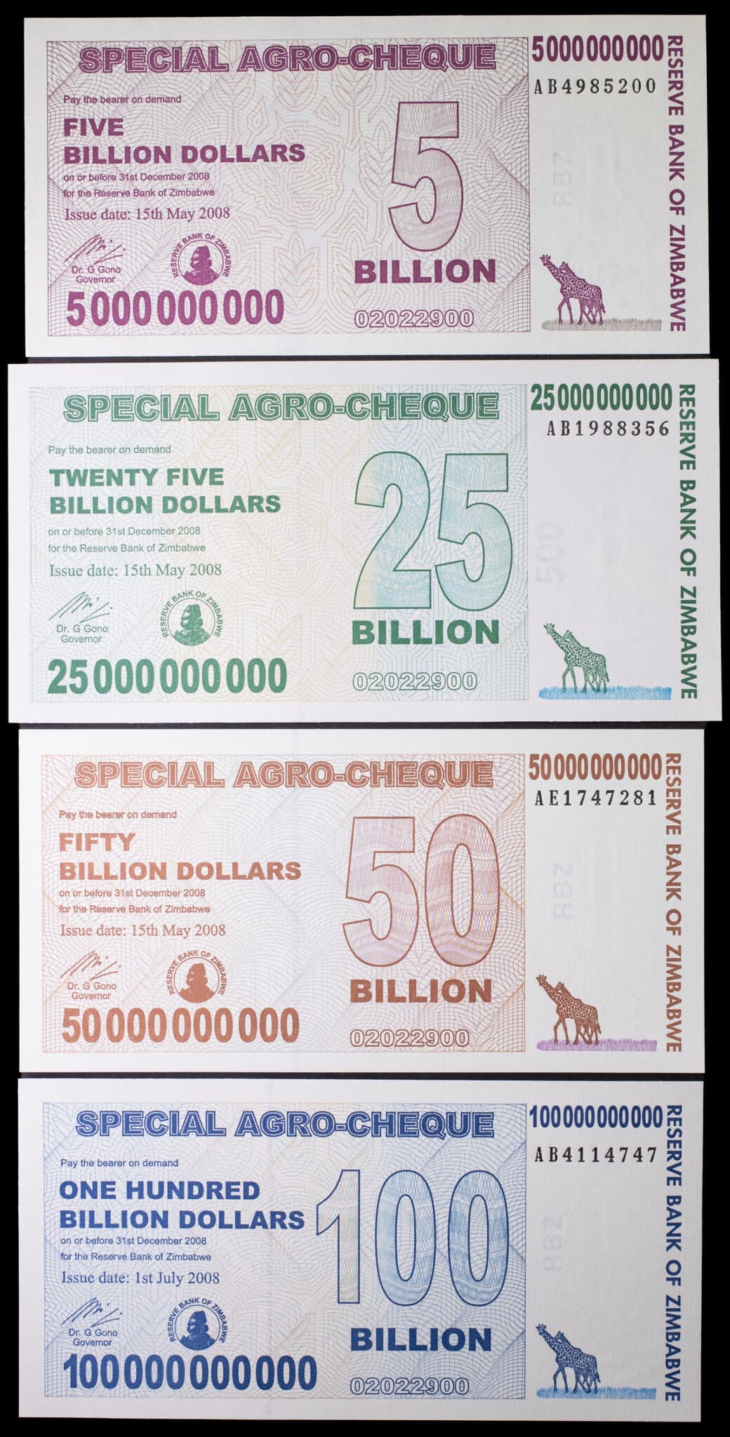 - Lot (4) - Série complète de 5 billion à 100 billion dollars - Agro-cheque 15 mai et 1er juillet 2008.