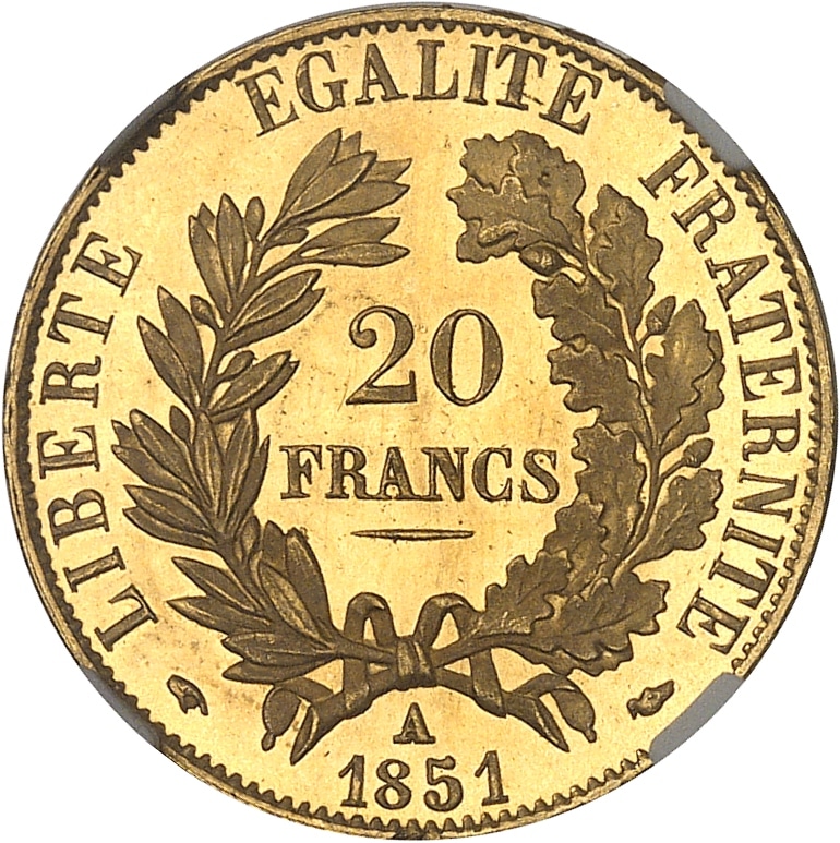 Rv. LIBERTE. EGALITE. FRATERNITE. Dans une couronne formée d’une branche d’olivier et d’une branche de chêne : 20 FRANCS. Au-dessous (atelier) et (date).