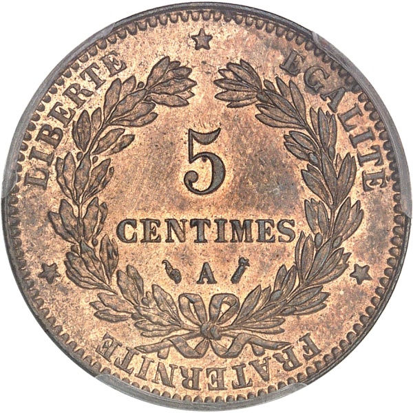Rv. LIBERTE. EGALITE. FRATERNITE. Dans une couronne formée de deux branches, sous une étoile : 5 CENTIMES (différent) (atelier) (différent).