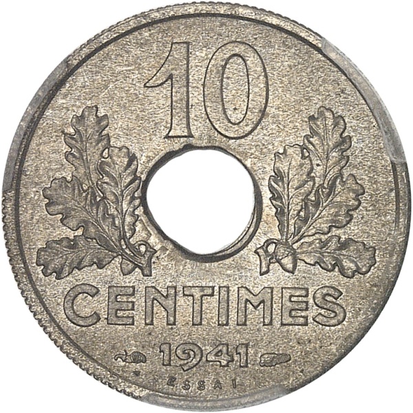 État Français (1940-1944). Essai de 10 centimes en maillechort 1941, Paris.