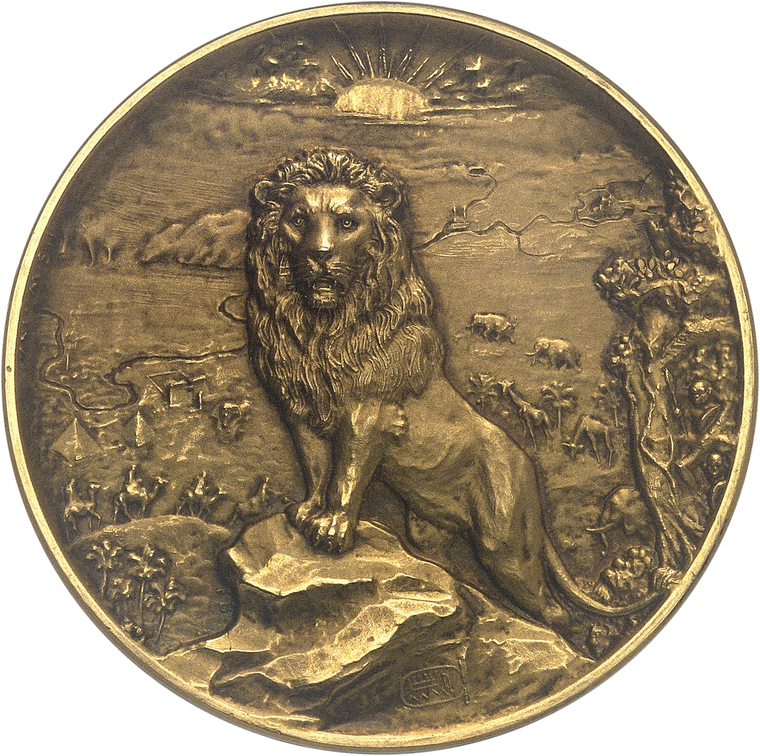 Rv. Dans un paysage de savane et de la plaine d’Égypte, un lion sur un rocher ; au bas un cartouche en hiéroglyphes ; signatures F. B et H. S. W. INV.
