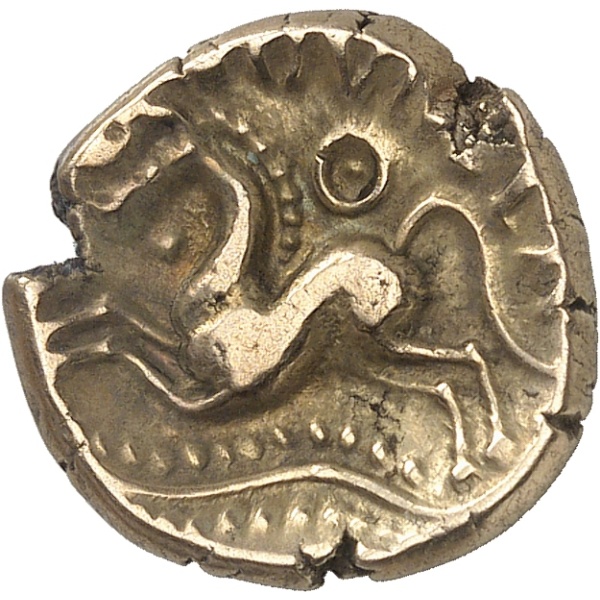 Cet exemplaire est épigraphe avec le nom de Dubnovellaunos en bord de flan. Un quart de statère presque aux mêmes types (mais anépigraphe) complète la série. Ce personnage au nom bien connu fait naître plus de questions que nous n'avons de réponse.. Les auteurs de l'ABC pensent que les deux personnages du même nom (en Essex et dans le Kent) seraient en fait le même personnage. Le droit de notre statère est caractéristique avec cette cassure et les deux annelets qui sont joints (probablement par une cassure de coin). Le n° 463 de la Vente 14007 de Spink est frappé avec les mêmes coins ; avec la légende un peu mieux centrée mais avec un métal défectueux au droit, il a été vendu 2.700£ en 2014