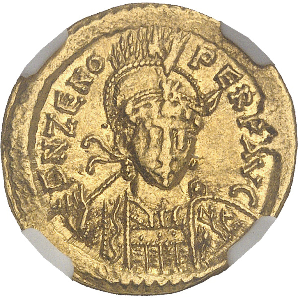 Av. DN ZENO PERP AVG. Buste couronné et cuirassé de face, tenant la lance et un bouclier orné d’un cavalier.