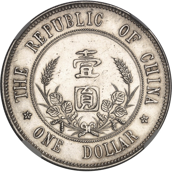 Rv. THE REPUBLIC OF CHINA / ONE DOLLAR. Caractères dans une couronne formée de deux branches.