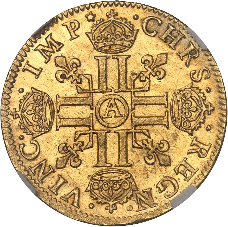 Rv. (à 12 h.) .CHRS. - .REGN. - .VINC. - .IMP (différent). Croix formée de huit L, chaque bras étant couronné, avec atelier en cœur, cantonné de quatre lis divergeant du centre.