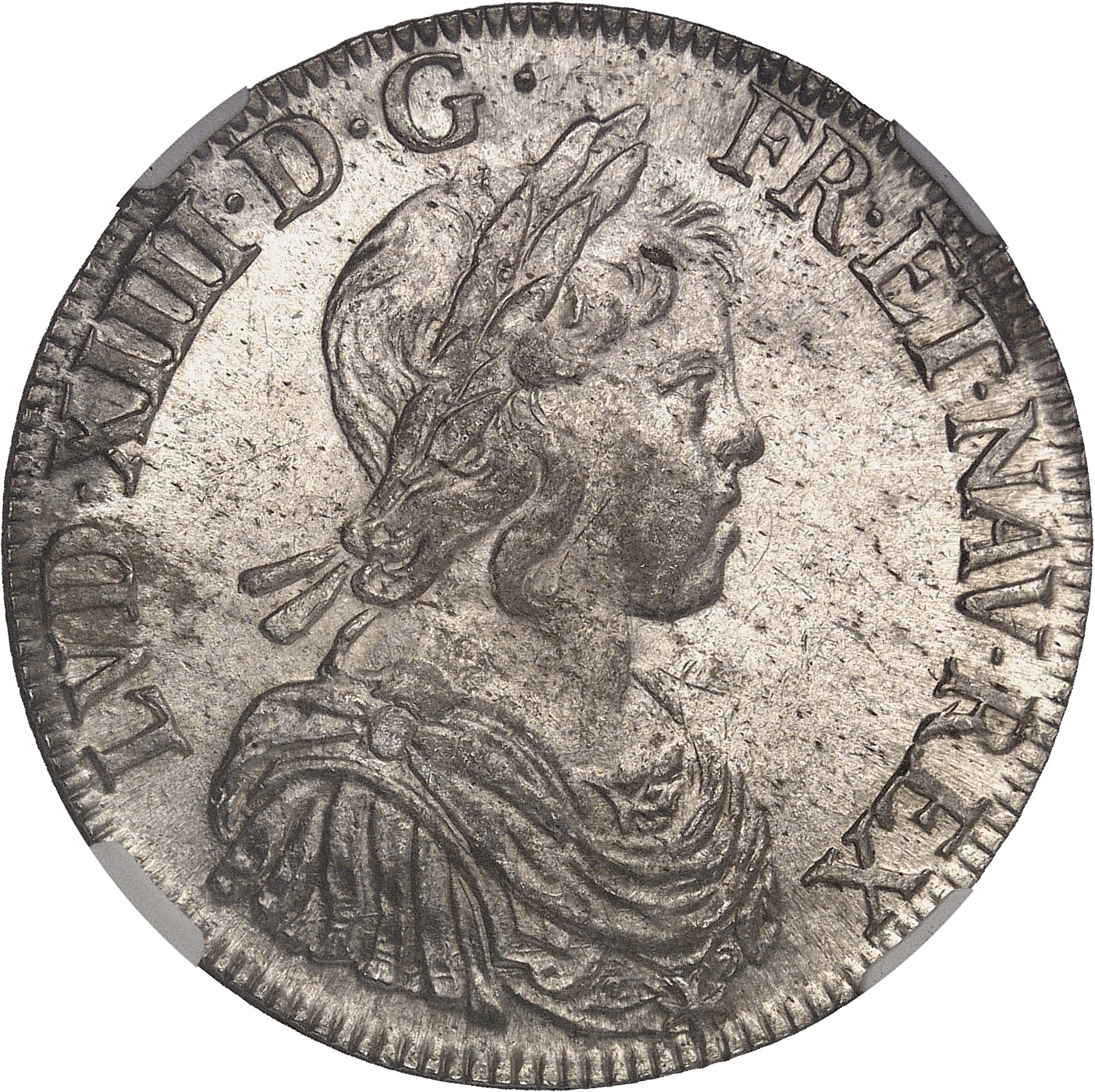 Av. LVD. XIIII. D. G. FR. ET. NAV. REX. Buste enfantin du Roi à droite, les cheveux courts, lauré, drapé et cuirassé à l’antique, avec l’ordre du Saint-Esprit.