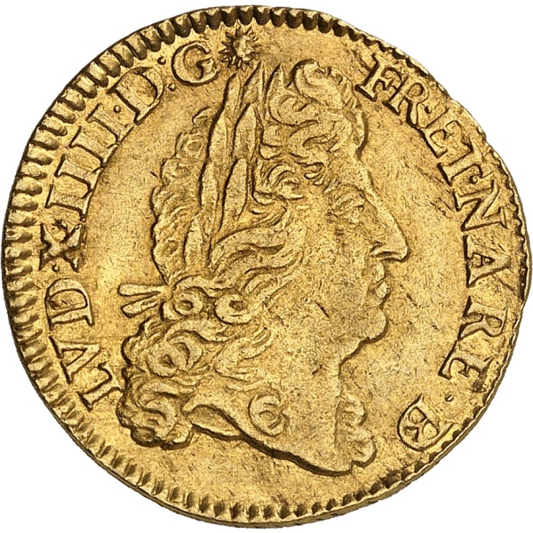 Av. LVD. XIIII. D: G. (soleil) - FR. ET. NA. RE. BD. Tête âgée du Roi à droite, avec une perruque laurée.