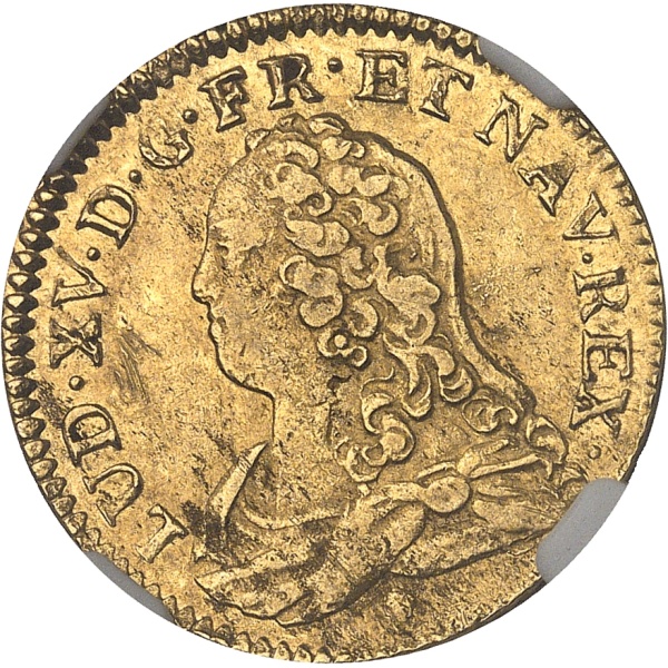 Av. LUD. XV. D. G. FR. ET. NAV. REX. Buste à gauche du Roi, drapé, la tête nue ; au-dessous (différent).