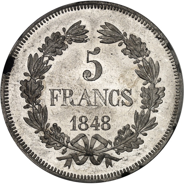 IIe République (1848-1852). Essai de 5 francs, 3e concours de Gayrard, Frappe spéciale (SP) 1848, Paris.