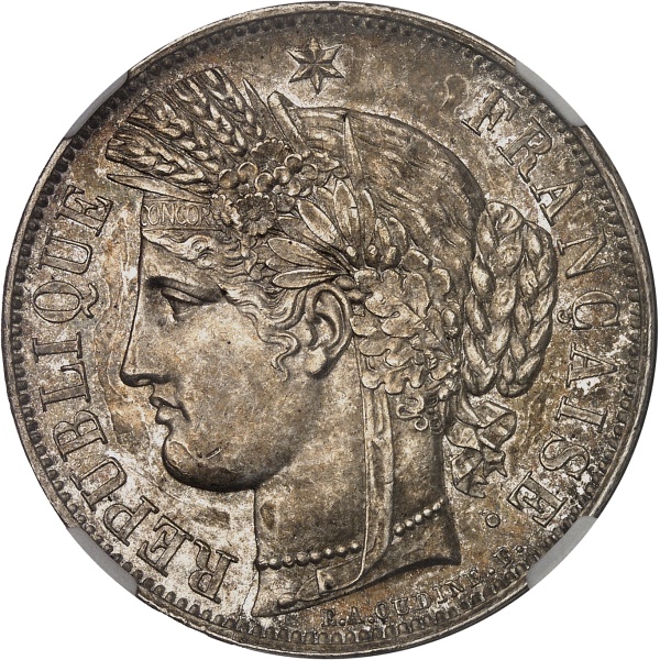 Av. RÉPUBLIQUE FRANÇAISE. Tête de la République à gauche en Cérès, sous une étoile, au-dessous signature E. A. OUDINÉ. F.