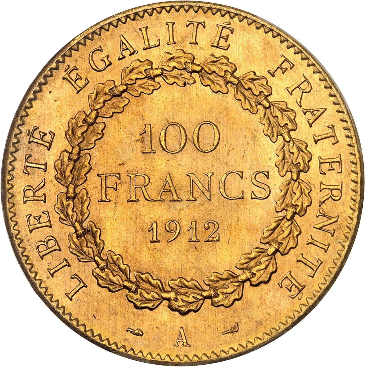 Rv. LIBERTÉ ÉGALITÉ FRATERNITÉ. Dans une couronne de chêne : 100 FRANCS (date) ; au-dessous (différent) (atelier) (différent).