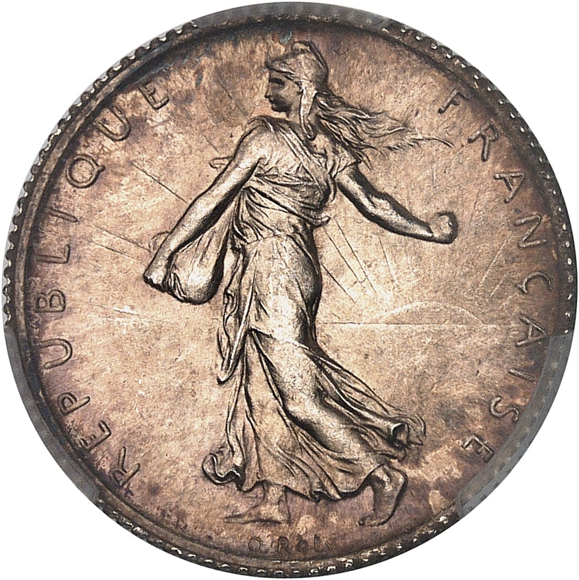 Av. REPUBLIQUE FRANÇAISE. La Semeuse à gauche, avec le soleil levant, marchant et semant à contre-vent ; signature O. ROTY.