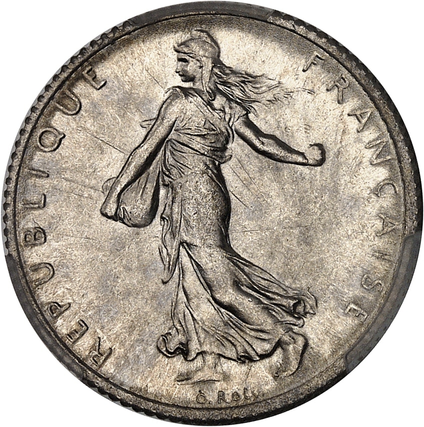 Av. REPUBLIQUE FRANÇAISE. La Semeuse à gauche, avec le soleil levant, marchant et semant à contre-vent ; signature O. ROTY.