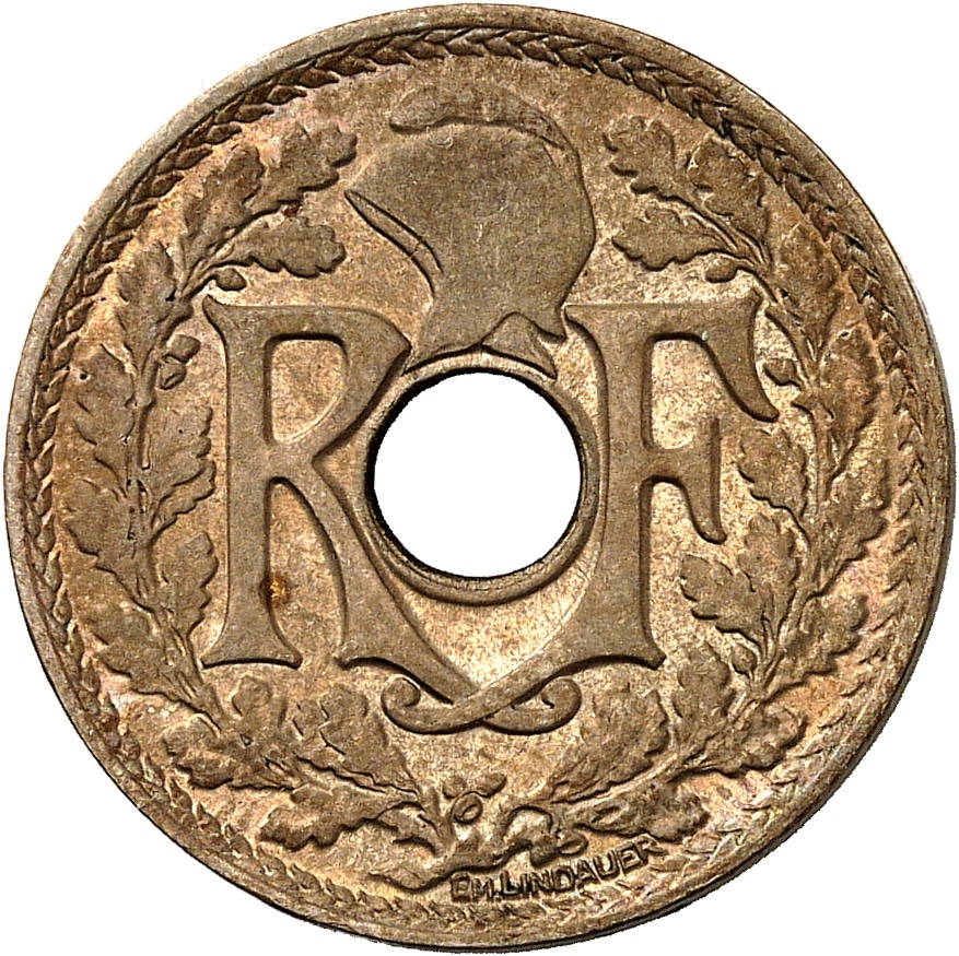 Av. RF autour du trou central surmonté d’un bonnet phrygien, le tout dans une couronne formée de deux branches, signature EM. LINDAUER.