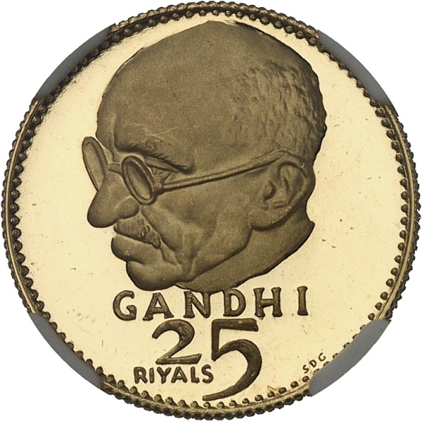 Av. GANDHI / 25 RIYALS. Buste de Gandhi de trois-quarts à gauche.