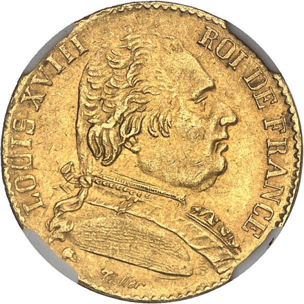 Av. LOUIS XVIII - ROI DE FRANCE. Buste habillé à droite, au-dessous signature Tiolier.
