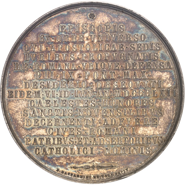 Rv. En quatorze lignes : EPISCOPIS EX. ORBE. VNIVERSO QVI. APOSTOLICAE. SEDIS IVRIBVS. PROPVGNATIS RE. ROMANA. VBIQVE. DEFENSA PII. IX. PONT. MAX. DESIDERIO. OBSEQVVTI EIDEM. VI. ID. IVN. AN. MDCCCLXII CAELESTES. HONORES SANCTIS. NOVENSILIBVS DECERNENTI. AD FVERE CIVES. ROMANI PATRIBVS. ET. ADSERTORIBVS CATHOLICI. NOMINIS et signature B. ZACCAGNINI EQ. TORQ. FECIT.