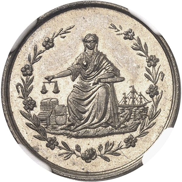 Av. Dans une couronne formée de deux branches avec fleurs, la Justice assise de face sur un quai avec les balances et un gouvernail, un trois-mâts en arrière-plan.