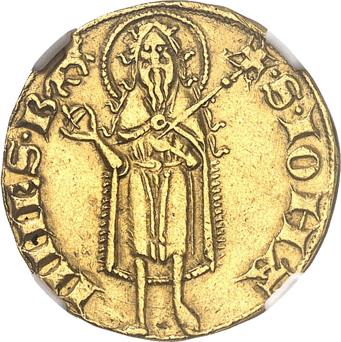 Rv. +. S. IOHA - NNES. B (différent). Saint Jean Baptiste debout de face, tenant un bâton surmonté d’une croix (celle de la légende).