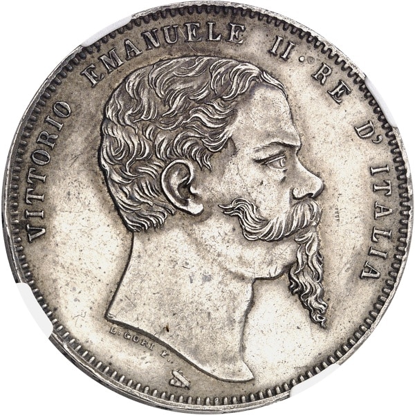 Rv. CINQUE LIRE ITALIANE. Dans une couronne formée de deux branches, écu couronné et entouré du collier de l’ordre de l’Annonciade ; au-dessous FIRENZE (faisceau) MARZO 1861.