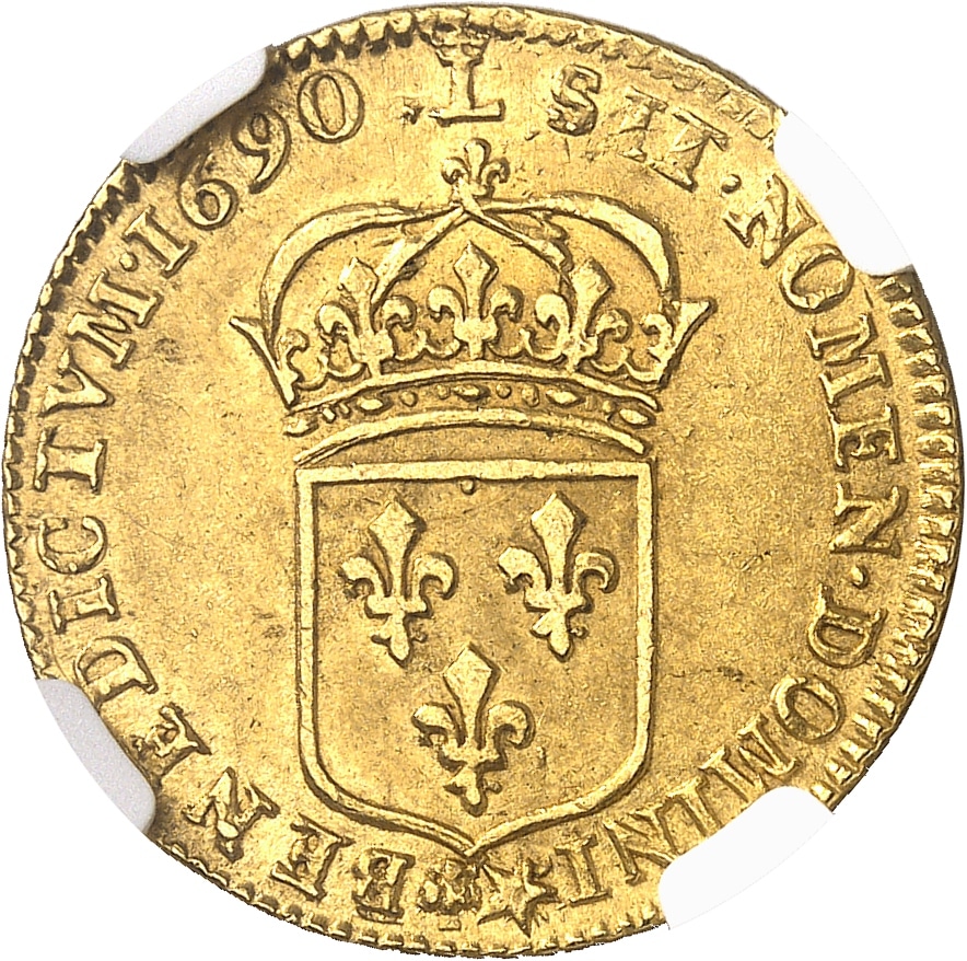 Louis XIV (1643-1715). Louis d’or à l’écu, buste du louis à la perruque 1690, L couronné, Lille.