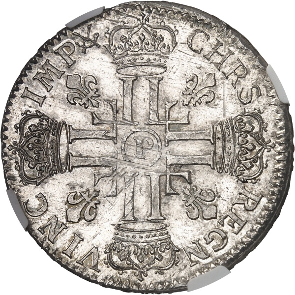 NGC UNC DETAILS REV SCRATCHED (5787365-031). Sur flan neuf, avec numérotation du roi LUD. XIV à Dijon. D’infimes stries d’ajustage. Une fine rayure au revers (pas de grade). Proche de son état de frappe avec son brillant d’origine. Superbe à Fleur de coin.