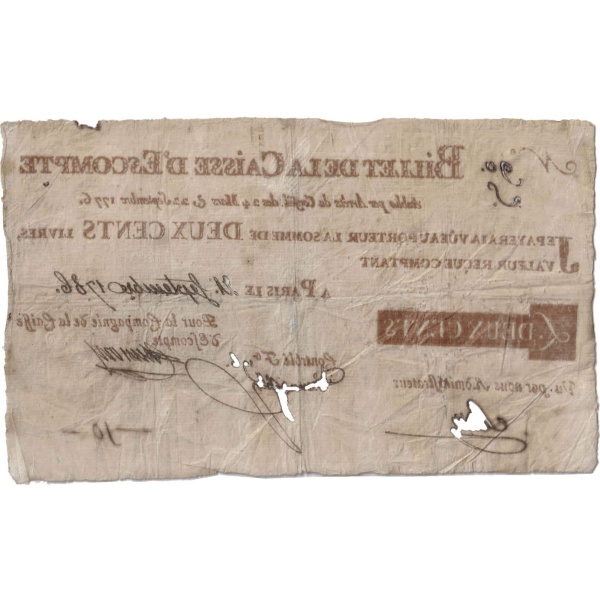 PCGS CHOICE FINE (45080586). Sans cachet au revers. Sur papier fin, filigrané CAISSE D’ESCOMPTE (papèterie d’Angoulême). Écritures manuscrites à l’encre d’époque, dont la plume a légèrement perforé le papier. Exemplaire gradé et certifié authentique par PCGS. Selon certaines opinions, ce billet pourrait être une contrefaçon d’époque, d’une grande rareté également pour une série mal documentée. Vendu comme tel. B.