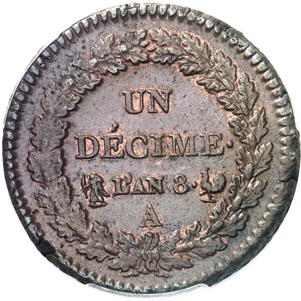 Rv. Dans une couronne de chêne : UN DÉCIME L’AN (date) (atelier).