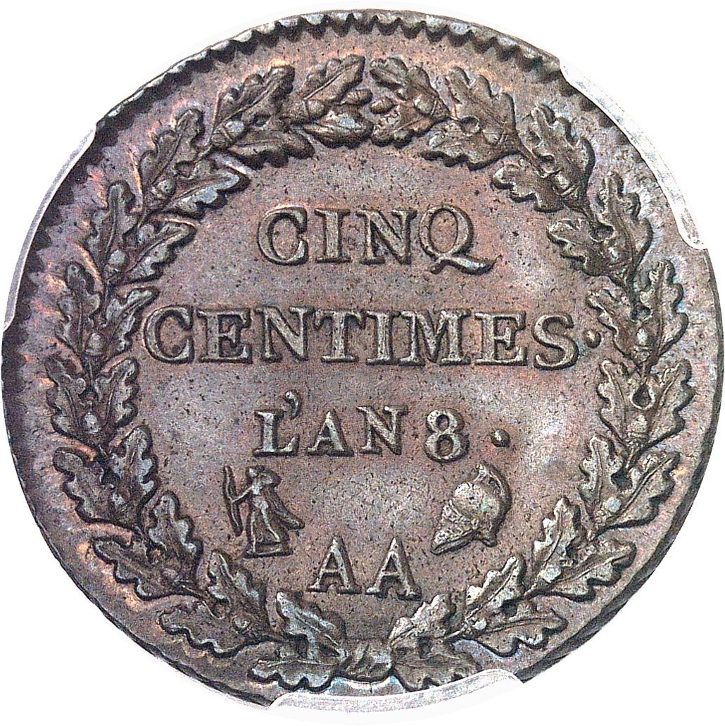 Directoire (1795-1799). Cinq centimes Dupré, grand module An 8 (1799), AA, Metz.