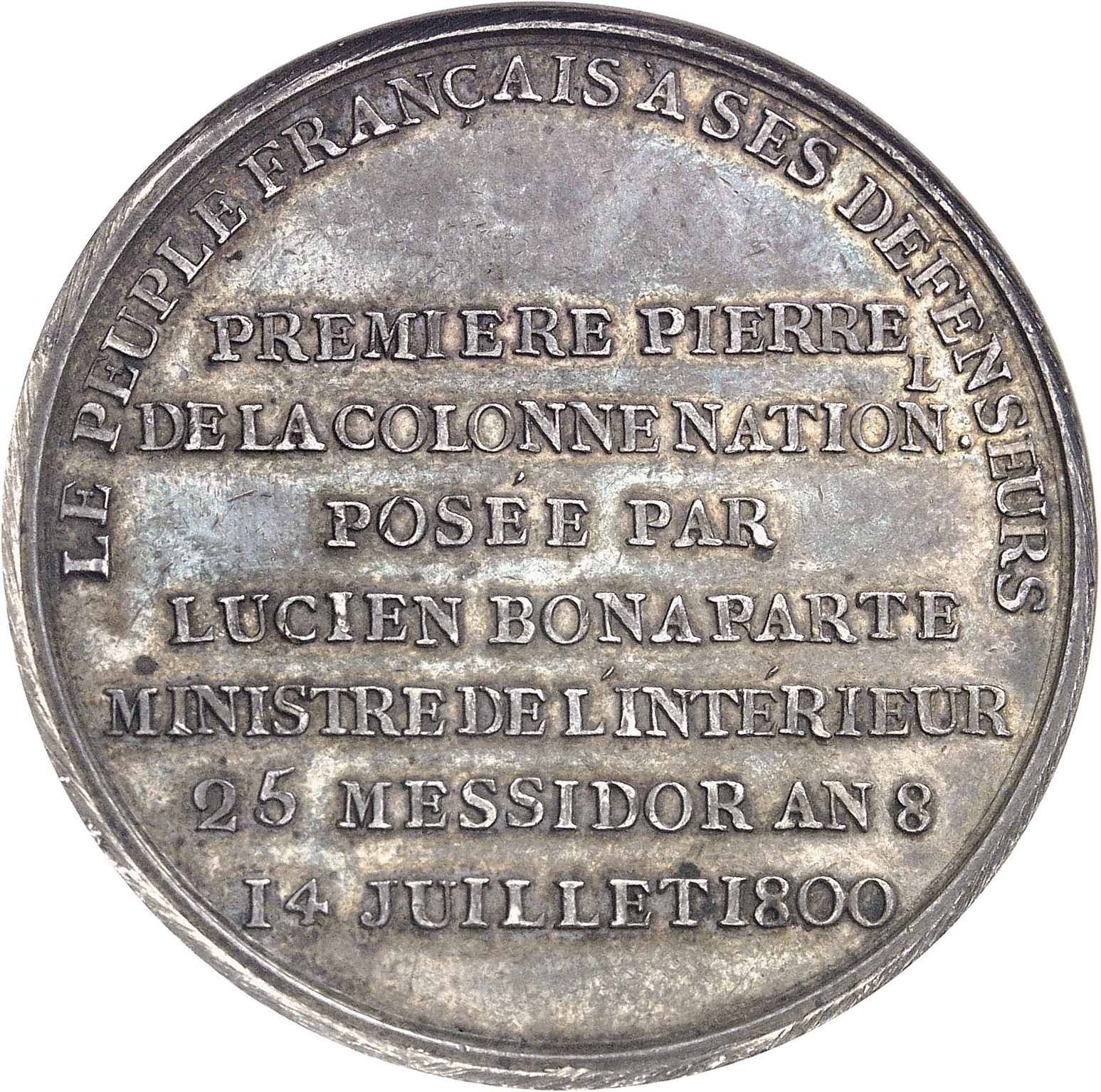 Rv. LE PEUPLE FRANÇAIS A SES DÉFENSEURS. Dans le champ : PREMIERE PIERRE DE LA COLONNE NATIONl POSÉE PAR LUCIEN BONAPARTE MINISTRE DE L'INTÉRIEUR 25 MESSIDOR AN 8 14 JUILLET 1800.