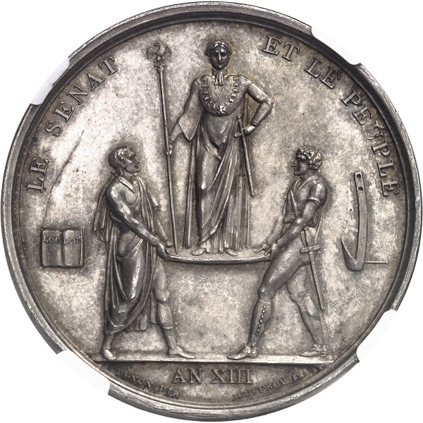 Rv. LE SENAT - ET LE PEUPLE. Napoléon debout sur un pavois, en costume de sacre, tenant un sceptre, le tout soutenu d'un côté par un sénateur avec les tables de la Loi et de l'autre un soldat avec un araire ; à l'exergue : AN XIII et signatures DENON DIR et JEUFFROY F.