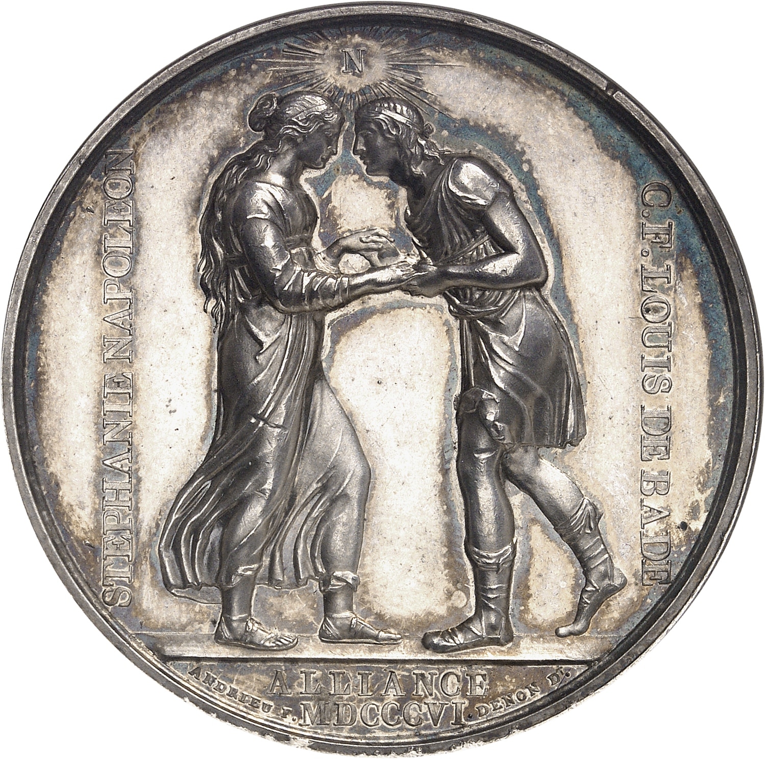 Rv. STÉPHANIE NAPOLEON (ascendant) et C. F. LOUIS DE BADE (descendant). Le prince de Bade et la princesse Stéphanie, sous les traits de Jacob et Rachel, unissent leurs mains au-dessous de la lettre N entourée de rayons ; à l’exergue ALLIANCE MDCCCVI et signatures ANDRIEU F. et DENON Dt.