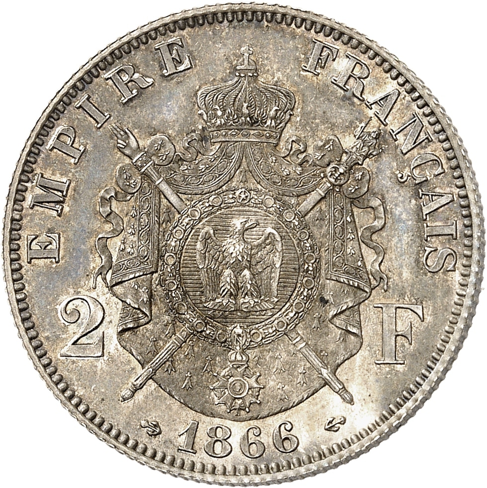 Second Empire / Napoléon III (1852-1870). Essai de 2 francs tête laurée, au double différent ancre, tranche cannelée, Flan bruni (PROOF) 1866, E, Paris.