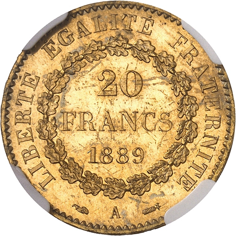 IIIe République (1870-1940). 20 francs Génie, Flan bruni (PROOF) 1889, A, Paris [SOUS FACULTÉ DE RÉUNION].