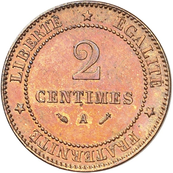 Rv. LIBERTE. EGALITE. FRATERNITE. Dans une couronne formée de deux branches, sous une étoile : 2 CENTIMES (différent) (atelier) (différent).