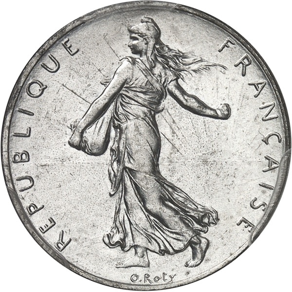 Av. REPUBLIQUE FRANÇAISE. La Semeuse à gauche, avec le soleil levant, marchant et semant à contre-vent ; signature O. ROTY.