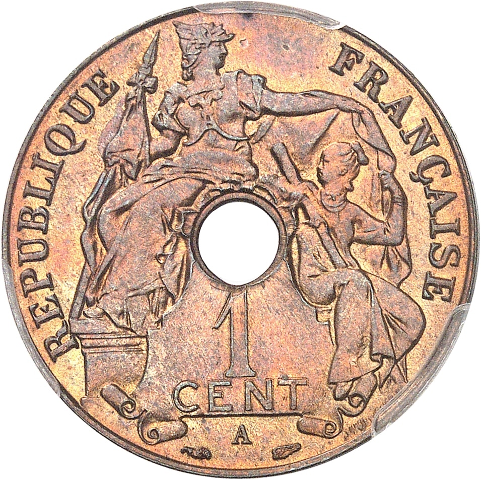 Av. REPUBLIQUE FRANÇAISE. Autour de la perforation centrale, la République étend un voile protecteur sur l’Indochine assise ; au-dessous 1 CENT et (atelier) ; signature DANIEL-DUPUIS.