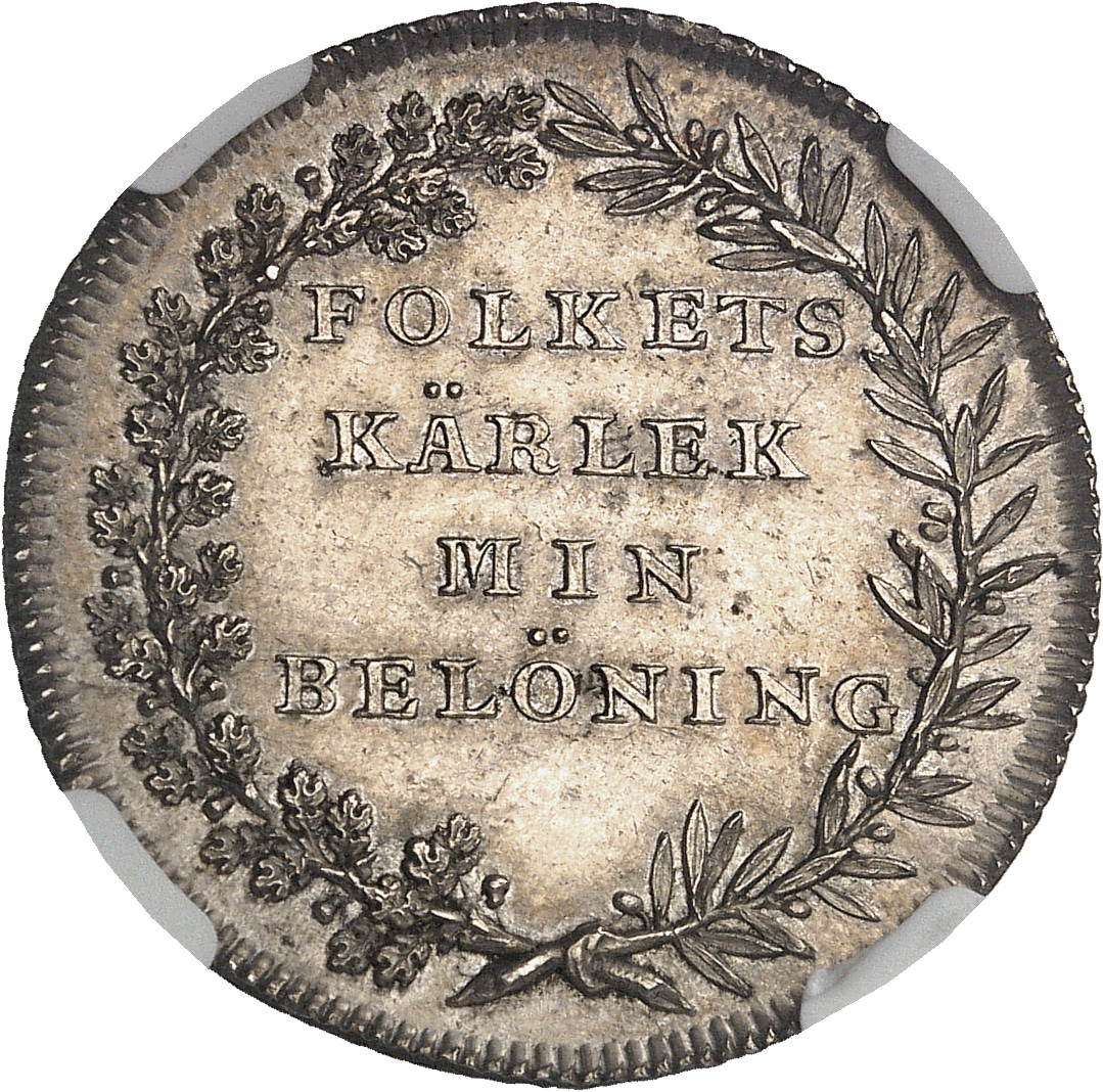 Rv. Dans une couronne formée de d’une branche de chêne et d’une branche de laurier : FOLKETS KÄRLEK MIN BELÖNING.